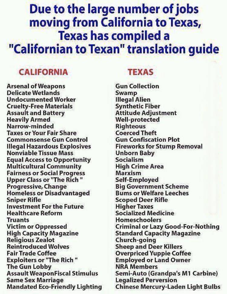 I recently came upon a post on Facebook whose major premise was that a “large number of jobs” were moving from California to Texas – along with a handy “translation guide” for Californian phrases into Texan (presumably to help with integrating Californians to Texas).